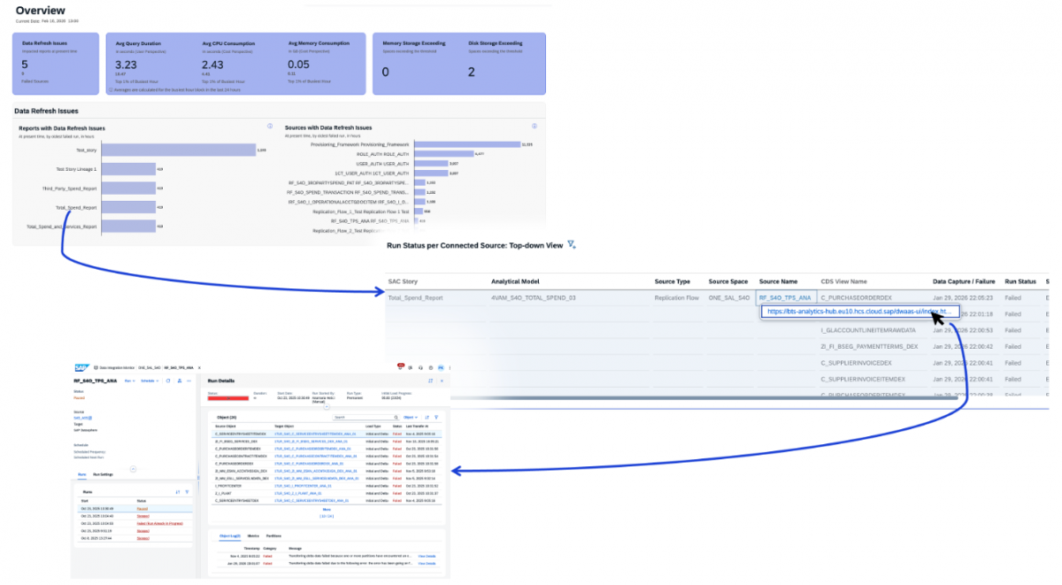 We monitor refresh failures, track problematic data retries, and focus on intensive queries by surfacing the most resource-heavy statements, additionally providing visibility into resource consumption across SAP Datasphere spaces to highlight usage patterns and potential imbalances. We focus on proactive governance - giving the client clear accountability, faster decision-making, and better control over their Datasphere landscape.